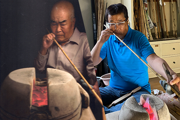 胴に指で漆を塗り、ふき取り仕上げを施して乾いたら研磨剤で光沢を出します。塗りと研磨を繰り返します。最後に竿を接続して曲がりを確認します。曲がっていたら、火力を落とした柔らかい火で修正火入れを行います。